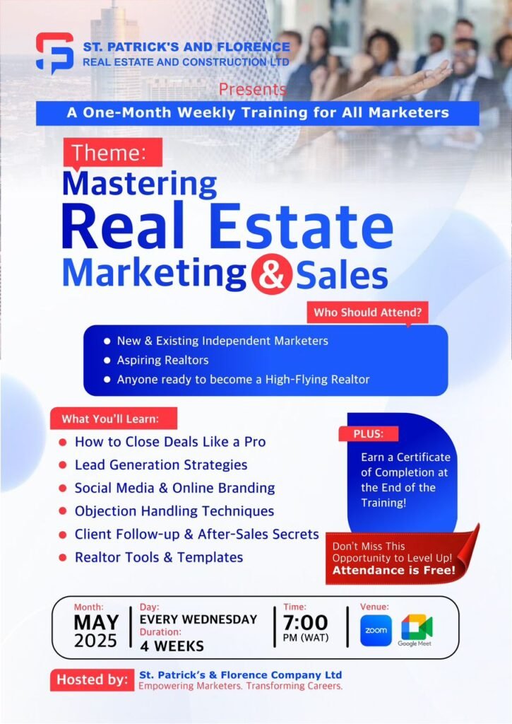 Mastering Real Estate Marketing & Sales Learn powerful strategies to boost your sales, generate leads, and grow your real estate brand — starting this May! Register Now Event Details Every Wednesday in May 7:00PM WAT Google Meet (Link will be emailed) Free Certificate Who Should Attend? New & Existing MarketersAspiring RealtorsAnyone ready to become a High-Flying Realtor Registration Form Full Name Email Phone (WhatsApp) Occupation/Role Register Now